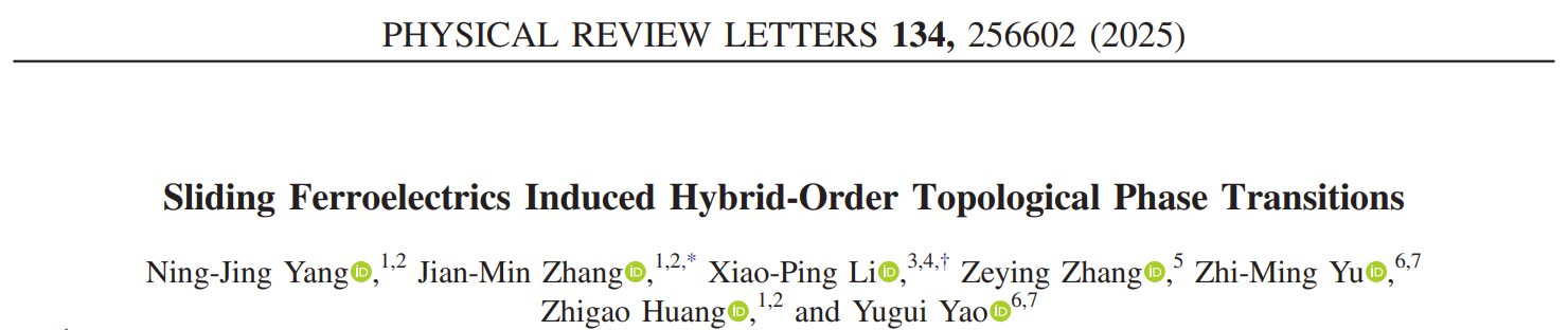 近日,我校物理科学与技术学院李小平研究员团队在铁电操控拓扑量子态方面取得重大突破,在物理学顶级期刊Physical Review Letters上发表题为“Sliding Ferroelectrics Induced Hybrid-Order Topological Phase Transitions”的研究成果。(论文链接:https://journals.aps.org/prl/pdf/10.1103/l1n5-1jsm)。李小平研究员为该论文的通讯作者,福建师范大学的张健敏教授为文章的共同通讯作者。