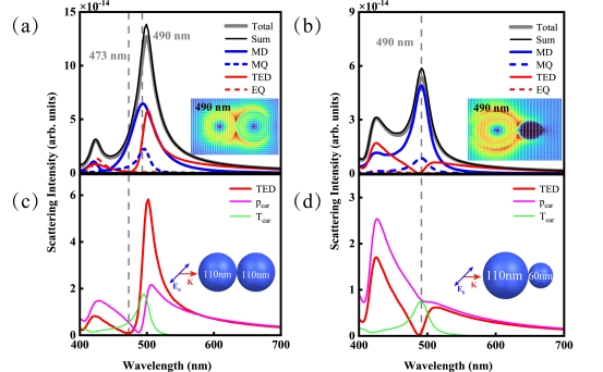 对于非磁性材料,其与可见光的相互作用主要由电场分量主导,磁场分量通常可忽略不计,这为磁光材料的设计带来了不小挑战。而李泽博士团队的研究发现,全介电硅纳米颗粒二聚体在平面波照射下能成为纯磁散射体:此时磁共振占据主导地位,电偶极响应被有效抑制。